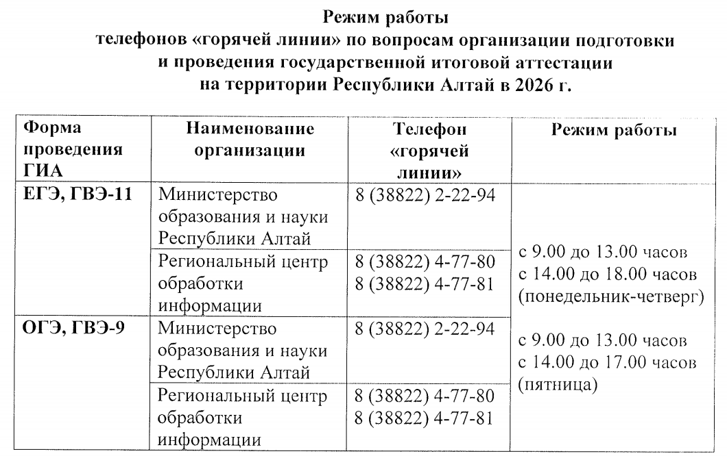 Ссылки на разделы «ГИА» и «Навигатор ГИА» официального сайта Рособрнадзора (obrnadzor.gov.ru), телефон «горячей линии» Рособрнадзора по вопросам ГИА и телефон доверия ГИА, на официальные сайты ФГБНУ «ФИПИ» (fipi.ru), ФГБУ «ФЦТ» (rustest.ru), Министерства образования и науки Республики Алтай (https://minobr-ra.ru/about/gosudarstvennaya-itogovaya-attestatsiya-gia-9-gia-11/), БУ РА «РЦОКО» (https://rcoko.ru/).