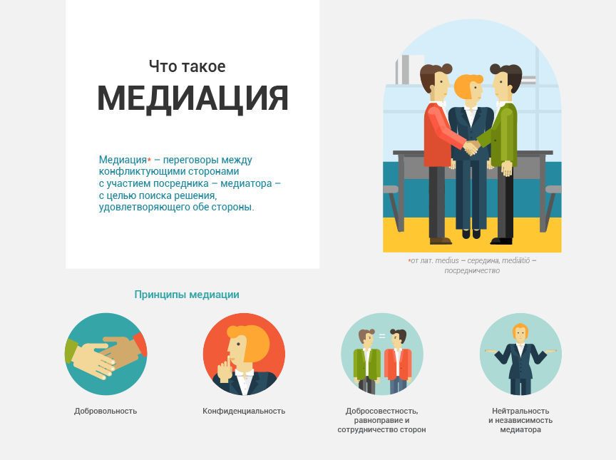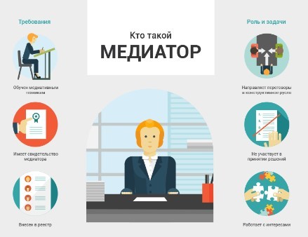 Кто такой медиатор- способ урегулирования споров при содействии медиатора (независимое лицо, привлекаемое в качестве третьей, нейтральной, незаинтересованной стороны, помогающей сторонам определить их позиции в споре, понять интересы друг друга) на основе добровольного согласия сторон в целях достижения ими взаимоприемлемого решения